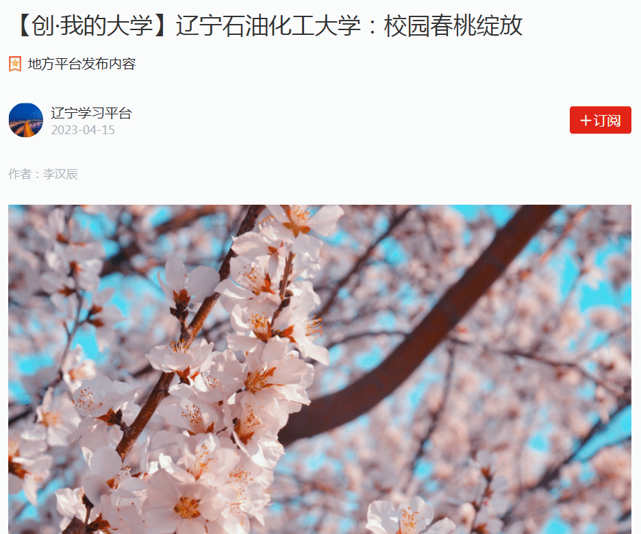 编者按:近日,学习强国辽宁学习平台对我校宣传部选送的李汉辰同学拍摄的校园春桃花图集进行了宣传报道。现将相关报道转载如下: